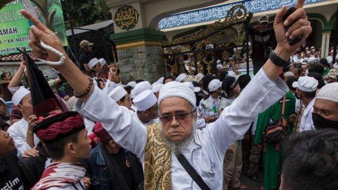 Image captionAksi 5 Mei 2017 dimulai dari Masjid Istiqlal menuntut agar Gubernur DKI Jakarta, Basuki Tjahaja Purnama diputus bersalah dalam kasus dugaan penistaan agama.