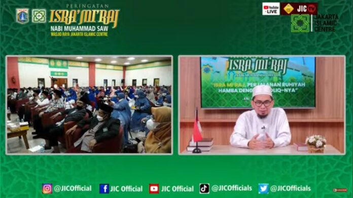 JIC- Peringati Isra’ Mi’raj, Pusat Pengembangan dan Pengkajian Islam Jakarta (PPPIJ) yang dikenal juga dengan Jakarta Islamic Centre menggelar Munajat dan Istighosah hybrid di ruang Audio Visual JIC, Senin (28/2/2022).