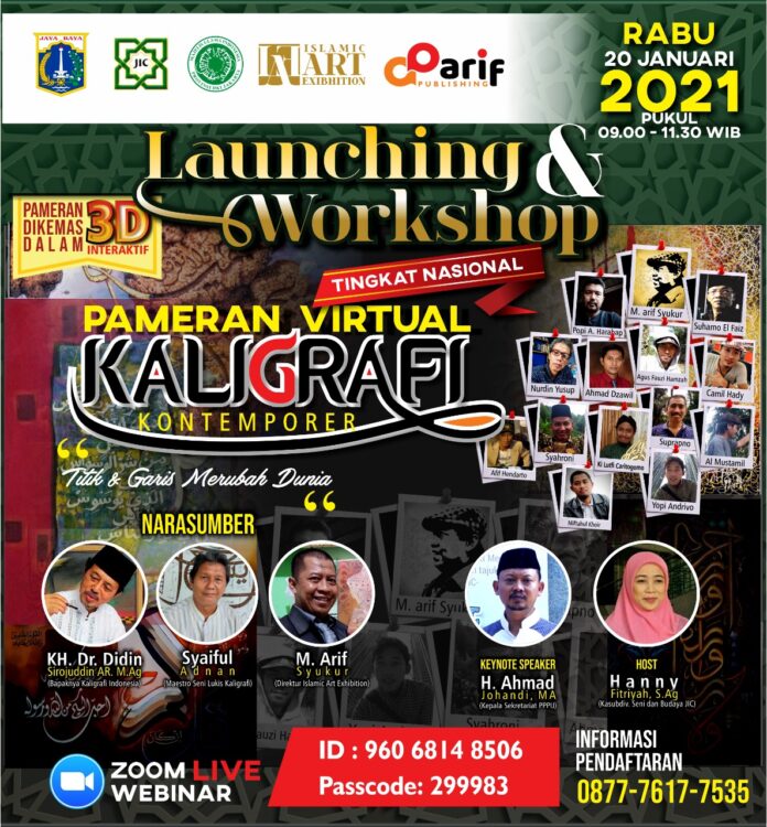 JIC – Jakarta Islamic Centre melalui Divisi Sosial Budaya akan menggelar pameran 3D interaktif pertama di awal tahun 2021. Mengusung tema “Titik & Garis Merubah Dunia”, kegiatan Pameran Virtual Kaligrafi ini direncanakan akan berlangsung pada hari Rabu (20/01) pukul 09.00 WIB melalui Zoom Live Webinar.