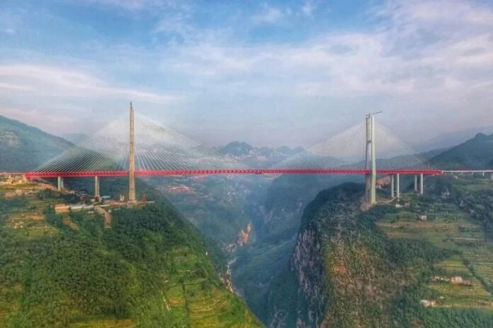 Jembatan yang membentang di atas lembah berbentuk huruf “U” di wilayah baratdaya China itu tinggi tiangnya rata-rata 565,4 meter dari permukaan air.
