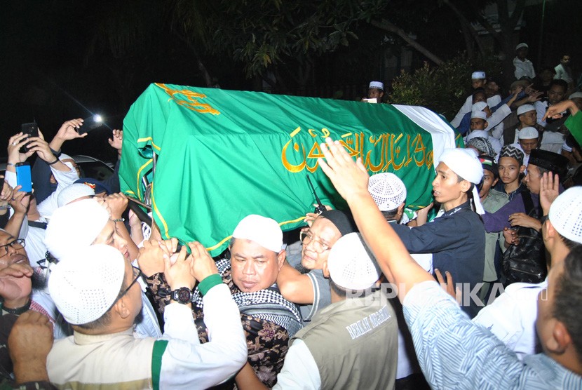 Jemaah memanggul keranda berisi jenazah almarhum Ustaz Muhammad Arifin Ilham di Masjid Az-Zikra, Sentul, Babakan Madang, Kabupaten Bogor, Jawa Barat, Kamis (23/5/2019).                                                                                           Foto: Antara/Arif Firmansyah
