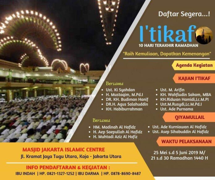 “Pada akhir Ramadhan ini Jakarta Islamic Centre menyelenggarakan i’tikaf berjmaah. JIC mengadakan kegiatan ini rutin setiap tahun pada malam 10 terakhir bulan Ramadhan” kata Ma’arif Fuadi Kepala Sub Divisi Dakwah Badan Manajemen JIC (27/5/19)