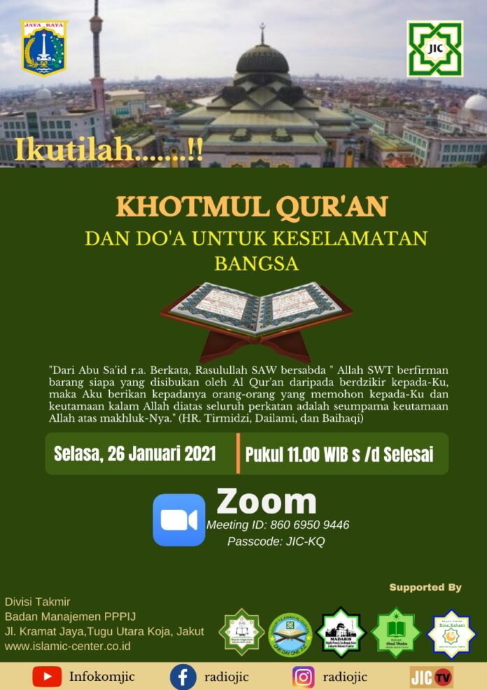 JIC – Saat ini Indonesia sedang dalam ujian dan masalah, maka sebagai upaya meraih pertolongan Allah SWT untuk mengatasi semua problem dan ujian ini, mari kita sama-sama ikuti acara Dzikir dan Do’a dalam acara KHOTMUL QUR’AN BULANAN. Sebagai salah satu cara ikhtiar kita untuk memohon kepada Allah SWT.