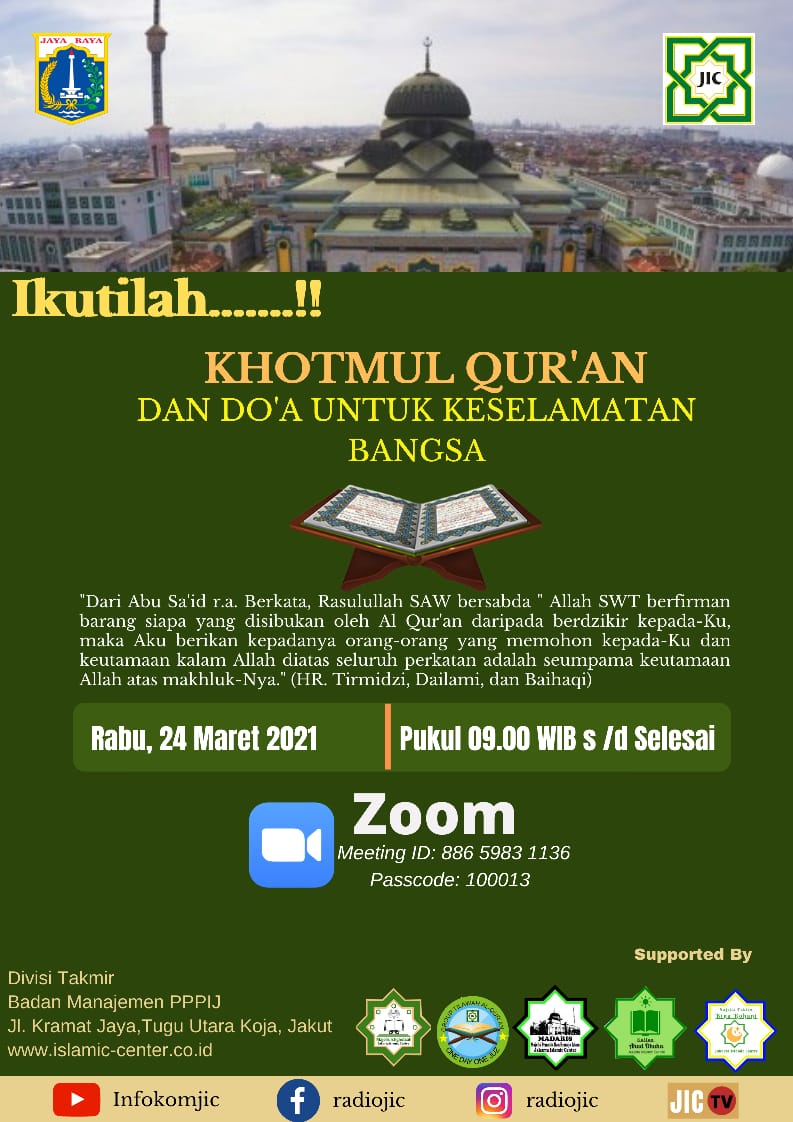 JIC – Saat ini Indonesia sedang dalam ujian dan masalah, maka sebagai upaya meraih pertolongan Allah SWT untuk mengatasi semua problem dan ujian ini, mari kita sama-sama ikuti acara Dzikir dan Do’a dalam acara KHOTMUL QUR’AN BULANAN. Sebagai salah satu cara ikhtiar kita untuk memohon kepada Allah SWT.