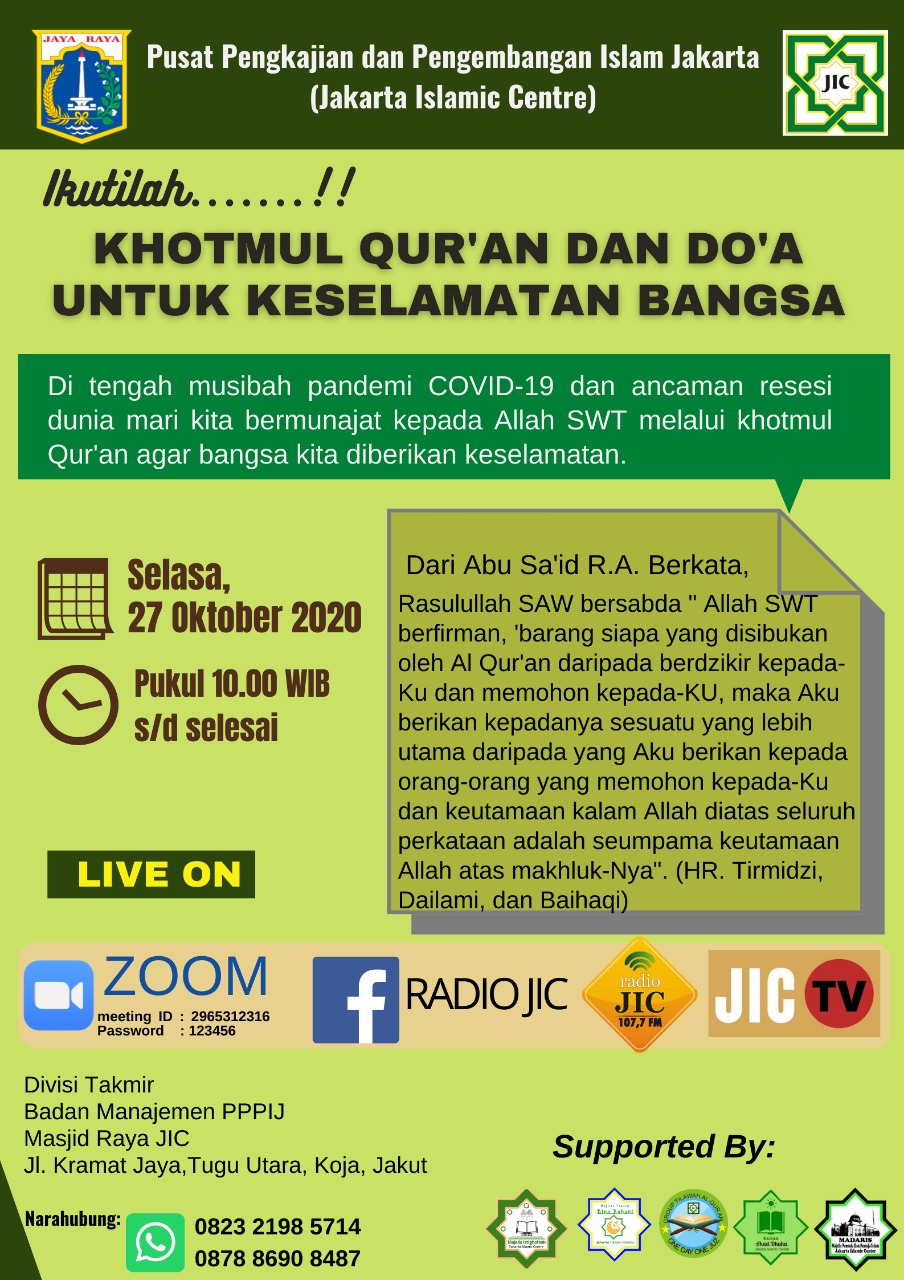 JIC – Saat ini Indonesia sedang dalam ujian dan masalah, begitu juga dengan Jakarta Islamic Centre. maka sebagai upaya meraih pertolongan Allah SWT untuk mengatasi semua problem & ujian ini, mari kita sama-sama ikuti acara dzikir & doa dalam acara KHOTMUL QUR’AN BULANAN. Sebagai salah satu cara ikhtiar kita untuk memohon kepada Allah.