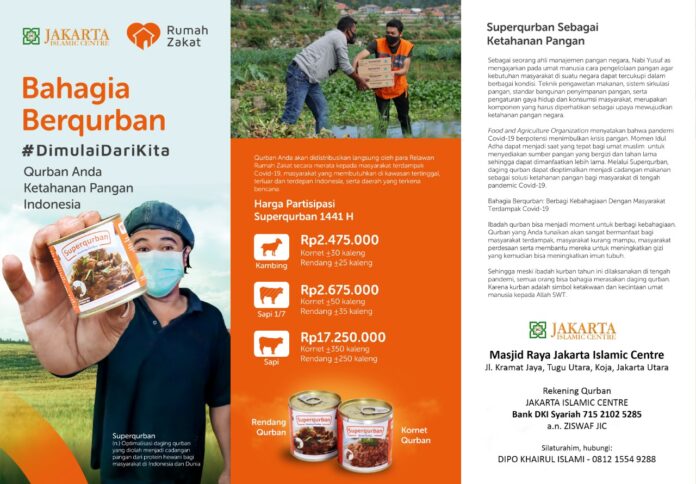Masjid Raya Jakarta Islamic Centre bekerjasama dengan Superqurban Rumah Zakat siap memberikan pelayanan terbaik pelaksanaan Qurban Idul Adha 1441 H. Daging Qurban akan langsung didistribusikan oleh para Relawan Rumah Zakat secara merata kepada masyarakat terdampak Covid-19. Panitia hanya menerima Qurban dalam bentuk uang dengan harga hewan :