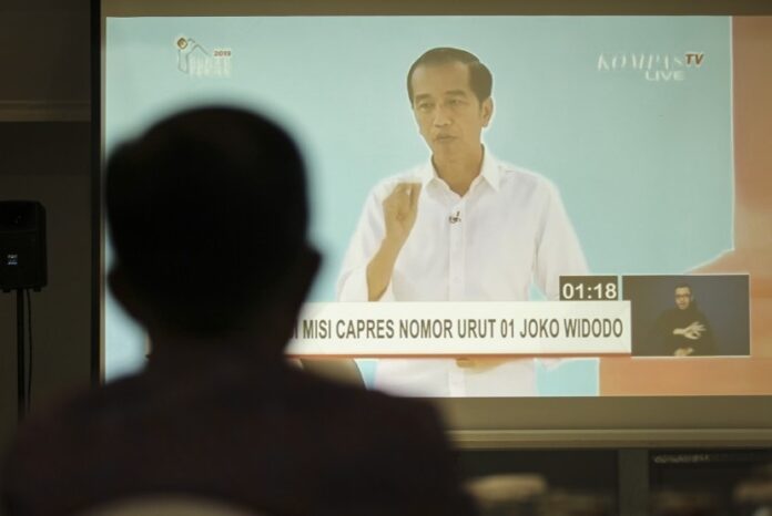 Siluet Wakil Presiden Jusuf Kalla menyaksikan siaran langsung Debat Kedua Pilpres 2019 di rumah dinasnya di Jalan Diponegoro, Jakarta, Ahad (17/2/2019).  Foto: Antara/Dhemas Reviyanto