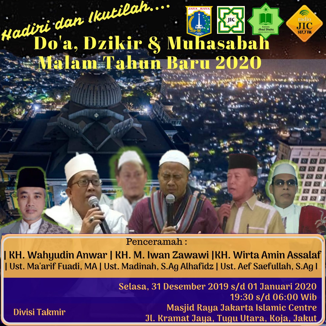 Penutup kegiatan tahun 2019 ini Divisi Takmir JIC menargetkan sebanyak 300 jamaah hadir dalam kegiatan Do’a, Dzikir dan Muhasabah malam pergantian tahun 2020 di Masjid Raya Jakarta Islamic Centre. Acara yang akan diselenggarakan pada Selasa (31/12) sampai dengan (1/1) dimulai pada pukul 19.30 WIB di ruang Ibadah Utama Masjid JIC. Penceramah yang dijadwalkan akan hadir pada kegiatan yang diselenggarakan oleh Divisi Takmir JIC ini ialah KH. Wahyudin Anwar, KH. M. Iwan Zawawi, KH. Wirta Amin Assalaf, Ustadz Ma’arif Fuadi, Ustadz Madinah dan Ustadz Aep Saefulloh. Masjid yang terletak di Kramat Jaya ini diharapkan Syiar dan dakwahnya semakin meluas pada tahun 2020 mendatang.