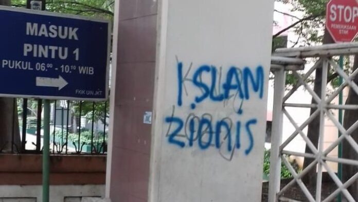 Dari foto yang diterima, coretan itu bertulisan ‘Islam Zionis’ di dua titik, pagar dan gerbang kampus UIN Jakarta. Selain itu, ada coretan gambar Bintang Daud yang di bagian tengahnya dituliskan ‘UIN’. Ada juga tulisan ‘F**K the System’.