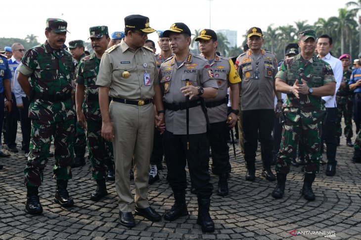 Kapolri Jenderal Pol Tito Karnavian (keempat kiri) berbincang dengan Gubernur DKI Jakarta Anies Baswedan (ketiga kiri) usai mengikuti Apel Konsolidasi Operasi Ketupat Jaya 2019 dan Kesiapan PAM Perselisihan Hasil Pemilihan Umum (PHPU) Mahkamah Konstitusi (MK) di Lapangan Monas, Jakarta, Kamis (13/6/2019). (ANTARA FOTO/M Risyal Hidayat/wsj)