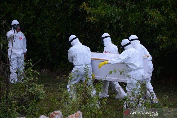 Petugas medis yang mengenakan APD lengkap mengangkat peti berisi jenazah pasien positif COVID-19 menuju lokasi pemakaman di Kabupaten Aceh Besar, Aceh, Kamis (16/7/2020). ANTARA FOTO/Ampelsa/aww/aa.