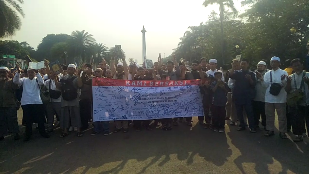 JIC– Ratusan orang, baik muslimin dan muslimat mengikuti aksi damai “Parade Memuliakan Al-Qur’an dan Mengecam Penistaan Al-Qur’an” di kawasan Monumen Nasional (Monas), Jakarta, Ahad (2/7), sebagai respon atas aksi pembakaran salinan Kitab Suci Al-Quran di Swedia beberapa waktu lalu.