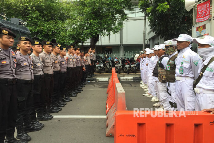 Massa dari API (Aliansi Pergerakan Islam) bersama dengan FPI (Front Pembela Islam) mengawal sidang PK Ahok di Pengadilan Negeri Jakarta Utara, Senin (26/2), massa masih terus berdatangan.                                                                                                   Foto: Rahma Sulistya
