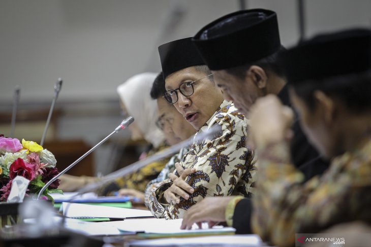 Menteri Agama Lukman Hakim Saifuddin menyampaikan paparan dalam rapat kerja bersama Komisi VIII DPR di Kompleks Parlemen, Senayan, Jakarta, Kamis (16/5/2019). Rapat tersebut membahas kebijakan Rancangan Peraturan Pemerintah (RPP) tentang Jaminan Produk Halal dan revisi BPIH 1440 H/2019 M. ANTARA FOTO/Dhemas Reviyanto/aww.