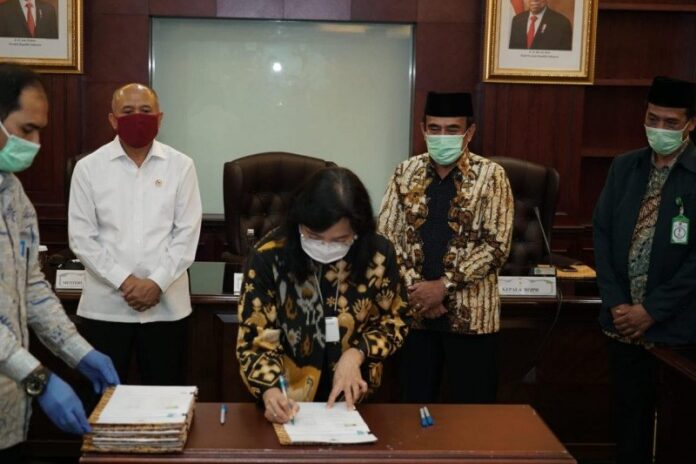 Direktur Jenderal Industri Kecil, Menengah dan Aneka (IKMA) Kementerian Perindustrian, Gati Wibawaningsih (tengah) menandatangani Nota Kesepahaman tentang Fasilitasi Penyelenggaraan Sertifikasi Halal bagi Pelaku Usaha Mikro Kecil di Jakarta, (13/8/2020). ANTARA/Biro Humas Kementerian Perindustrian/pri