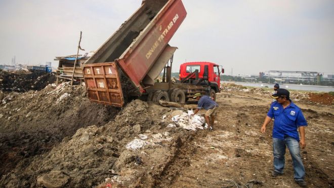 Image captionPekerja menggunakan alat berat menggarap proyek ‘reklamasi’ Ancol di Jakarta, Sabtu (04/07).
