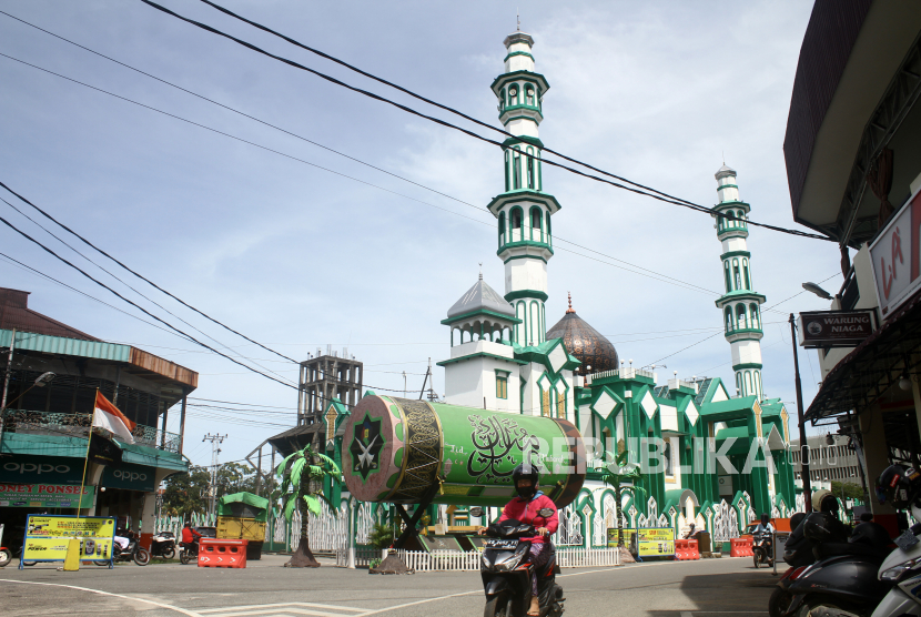 Sejumlah pengendara motor melintas di dekat Masjid Raya di Kota Singkawang, Kalimantan Barat, Jumat (12/11/2021). Masjid Raya Singkawang yang pertama kali didirikan pada tahun 1885 dan merupakan salah satu masjid tertua di Kalimantan Barat tersebut menjadi salah satu landmark kota di Singkawang. Foto: ANTARA/Jessica Helena Wuysang