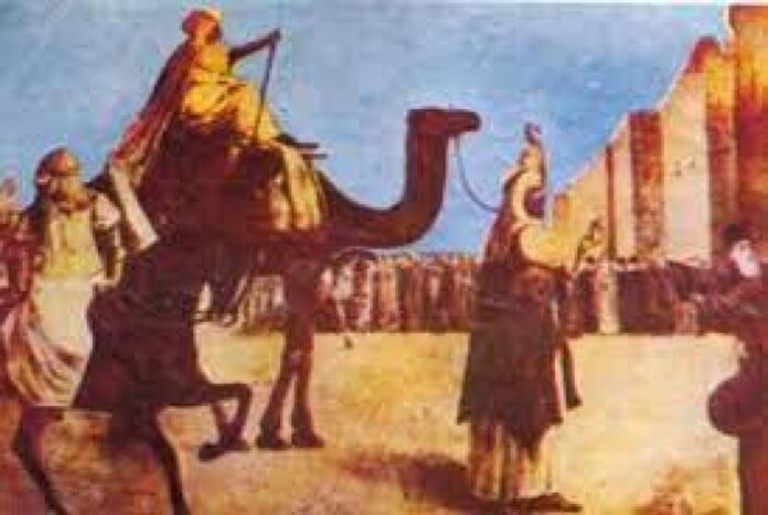 Umar bin Khattab menuntun unta yang ditunggangi pemantunya saat masuk ke Yerusalem. (ilustrasi)