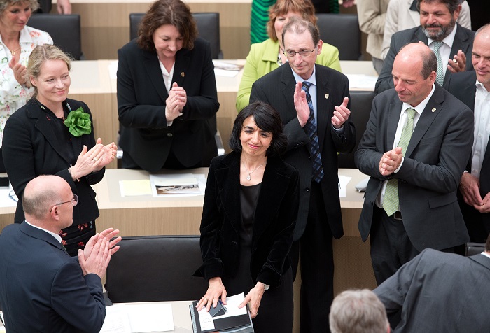 Die neu gewählte Präsidentin des Landtags von Baden-Württemberg, Muhterem Aras (Bündnis 90 / Die Grünen, M), nimmt am 11.05.2016 in Stuttgart (Baden-Württemberg) nach ihrer Wahl bei der konstituierenden Sitzung Glückwünsche von Landtagsabgeordneten entgegen. Die türkischstämmige Aras wurde von den Grünen als neue Landtagspräsidentin nominiert und ist die erste Muslimin und die erste Frau an der Spitze des hohen Hauses. Foto: Bernd Weißbrod/dpa (zu dpa: «Landtag wählt Muhterem Aras zur Präsidentin - Erste Muslimin» vom 11.05.2016) +++(c) dpa - Bildfunk+++