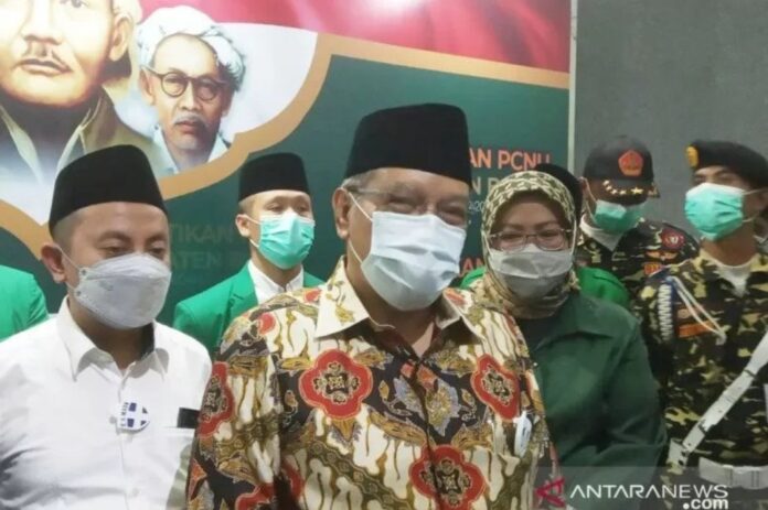 Ketua Umum Nadhlatul Ulama (PBNU), KH Said Aqil Siradj saatmenghadiri pengukuhan pengurus PCNU Kabupaten Bogor di Cibinong, Bogor, Jawa Barat, Selasa (6/4/2021). (ANTARA/M Fikri Setiawan)