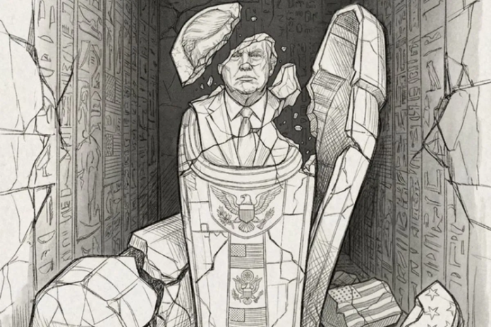 Gambar yang dibagikan di akun resmi Khamenei di platform X itu menampilkan sebuah sarkofagus bergaya firaun yang tampak runtuh dengan wajah menyerupai Trump, disertai tulisan “Seperti Firaun.”