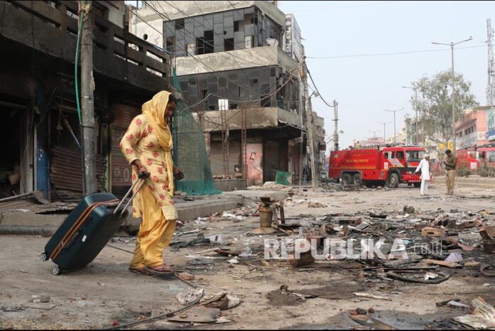 Akibat rusuh dan pembantaian di ibu kota India itu pemandangan kota kini meninggalkan petak-petak bekas puing sehingga tampak seperti zona perang. Itu terlihat dengan masjid-masjid yang terbakar, toko-toko dan bangunan-bangunan lain, pecahan kaca dan kendaraan yang hangus.