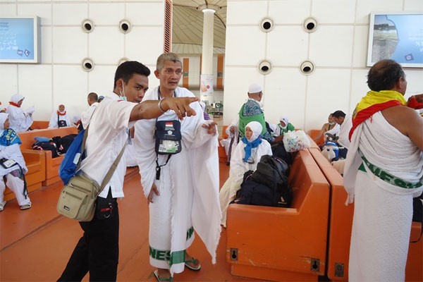 Salah seorang petugas Tenaga Musiman (Temus) dari Sektor I Bandara Jeddah sedang membantu jamaah menunjukkan lokasi tempat rombongannya berada (8/9/2015). (kemenag.go.id)