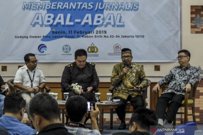 Arsip Wakil Ketua Perhumas Heri Rakhmadi (kedua kanan) bersama Kadiv Humas Mabes Polri Irjen Pol M. Iqbal (kedua kiri) bersama Plt. Kepala Biro Humas Kemkominfo Ferdinandus Setu (kiri), dan Ketua Dewan Pers Yosep Adi Prasetyo (kanan) menjadi pembicara dalam diskusi publik di Gedung Dewan Pers, Jakarta, Senin (11/2/2019).
