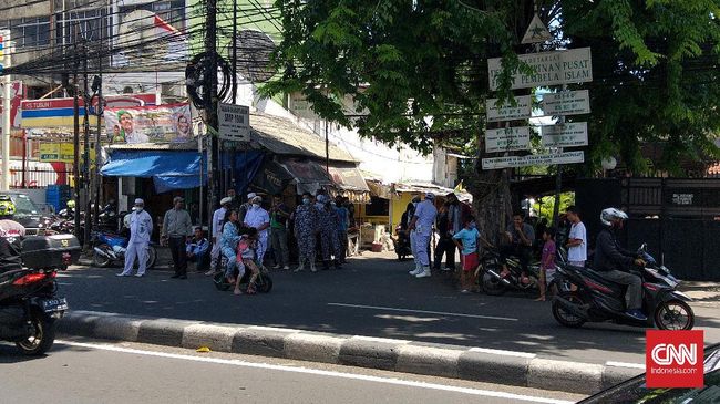 Pantauan CNNIndonesia.com di lokasi, pria berseragam putih-putih yang identik dengan laskar FPI itu sudah berjaga sejak pukul 07.30 WIB. Tampak lima orang berpakaian laskar berjaga di pintu masuk Jalan Petamburan 3.