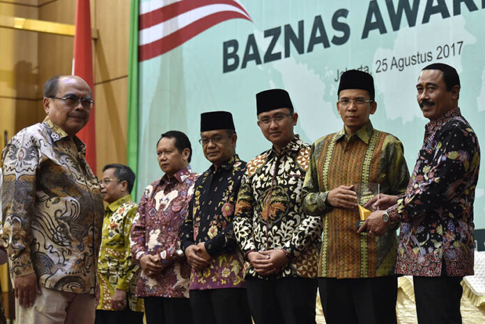 Ketua Badan Amil Zakat Nasional (BAZNAS) Bambang Sudibyo (kiri) bersama Sekjen Kemendagri Hadi Prabowo (kanan) menyerahkan penghargaan kepada Gubernur Nusa Tenggara Barat (NTB) Tuan Guru Bajang (TGB) Muhammad Zainul Majdi (kedua kanan), Wakil Gubernur Banten Hazrumy (ketiga kanan) dalam Baznas Award 2017 di Jakarta, Jumat (25/8). Baznas Award 2017 diberikan kepada provinsi, kabupaten atau kota, Lembaga Amil Zakat, Unit Pengumpul Zakat pemerintah serta kepala daerah terpilih yang diniai konsisten mendukung potensi dan realisasi zakat di tengah masyarakat. ANTARA FOTO/Puspa Perwitasari/foc/17.