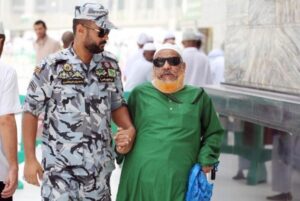 Petugas keamanan Masjidil Haram membimbing jamaah haji yang buta saat tersesat