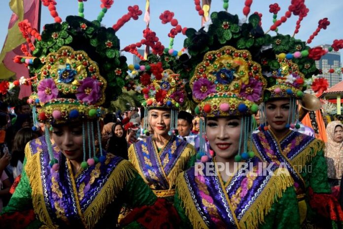 Penari menghibur pengunjung yang memadati acara Lebaran Betawi 2019 di lapangan silang Monumen Nasional (Monas), Jakarta, Ahad (21/7).                         Foto: Republika/Prayogi
