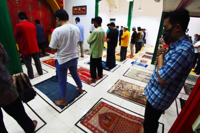 Jamaah Masjid Lautze 2 Bandung menjalankan ibadah shalat Jumat di masjid, Jl Tamblong, Bandung, Jumat (16/10). Setelah Pembatasan Sosial Berskala Besar pertama di Kota Bandung dibuka kembali masjid ini kembali melayani shalat Jumat dengan menerapkan proto | REPUBLIKA