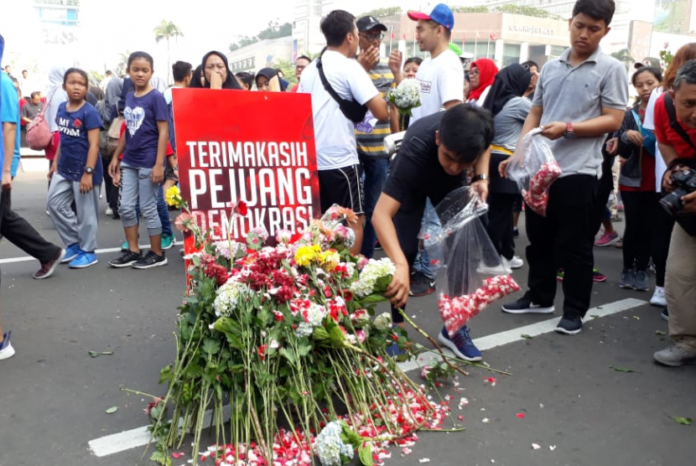 Relawan milenial Jokowi-Ma’ruf mengadakan aksi doa dan tabur bunga pada Ahad, (28/4) di kawasan bundaran HI Jakarta. Mereka mendoakan para penyelenggara pemilu yang sakit dan meninggal selama pemilu serentak 2019.        Foto: Republika/Rizky Suryarandika