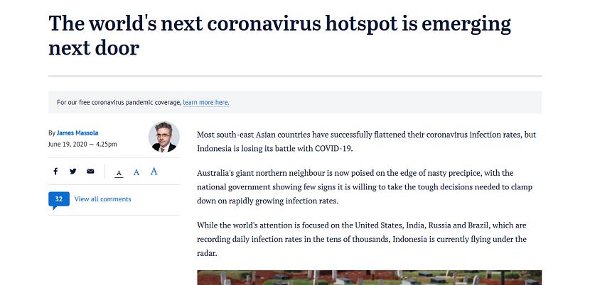 JIC, JAKARTA — Media Australia, the Sydney Morning Herald (SMH), menyebut Indonesia akan menjadi hotspot atau pusat Covid-19 di dunia. Dalam tulisan James Massola tersebut dikatakan kebanyakan negara di Asia Tenggara berhasil melandaikan kurva penularan Covid-19, tetapi tidak dengan Indonesia. Pemerintah Indonesia dinilai telah gagal berperang melawan Covid-19.