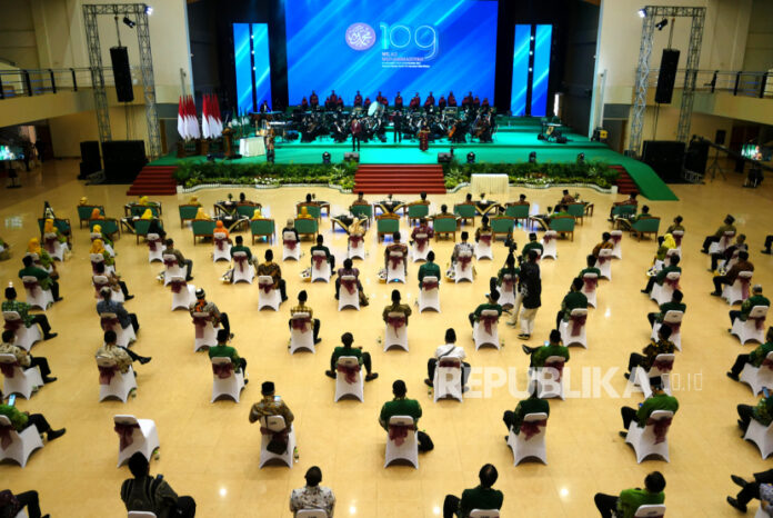 Hiburan kesenian saat Resepsi Milad ke-109 Muhammadiyah di Sportorium Universitas Muhammadiyah Yogyakarta, Kamis (18/11). Pada Milad Muhammadiyah kali ini mengangkat tema Muhammadiyah optimis hadapi pandemi dan komitmen menebar nilai utama. Resepsi ini juga dihadiri Presiden Joko Widodo secara daring. Peserta yang hadir juga sangat terbatas dan menggunakan protokol kesehatan Covid-19 ketat.  Foto: Wihdan Hidayat / Republika