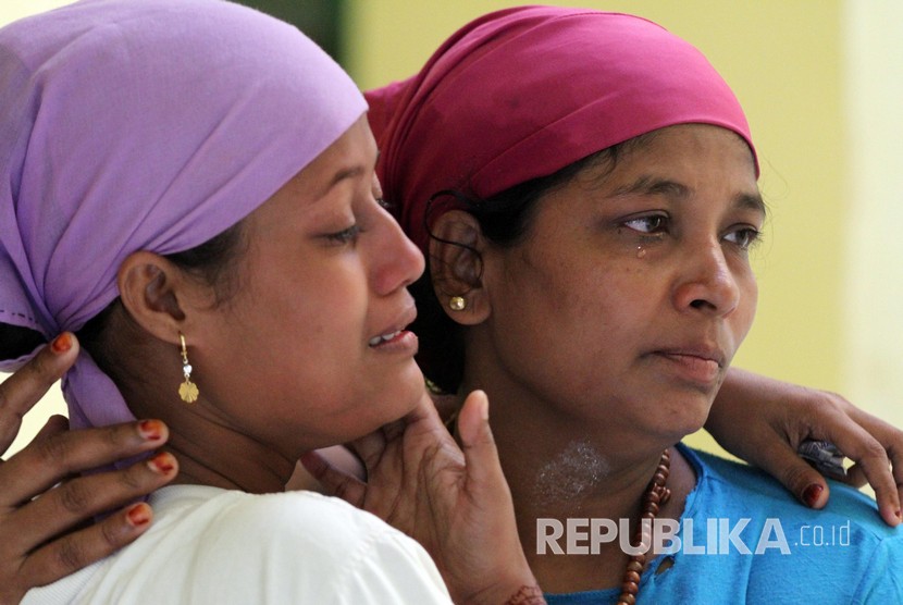 Pengungsi Rohingya Myanmar saling berpelukan dan menangis pada pagi Lebaran Idulfitri 1439 H di penampungan sementara komplek SKB Cot Gapu, Bireuen, Provinsi Aceh. Jumat (15/6). Para pengungsi larut dalam kesedihan mengingat keluarga mereka yang meninggal dunia dan rasa terharu merasakan kenyamanan selama beribadah Ramadan dan ber Idul Fitri di Aceh. ANTARA FOTO/Rahmad/hp/18.