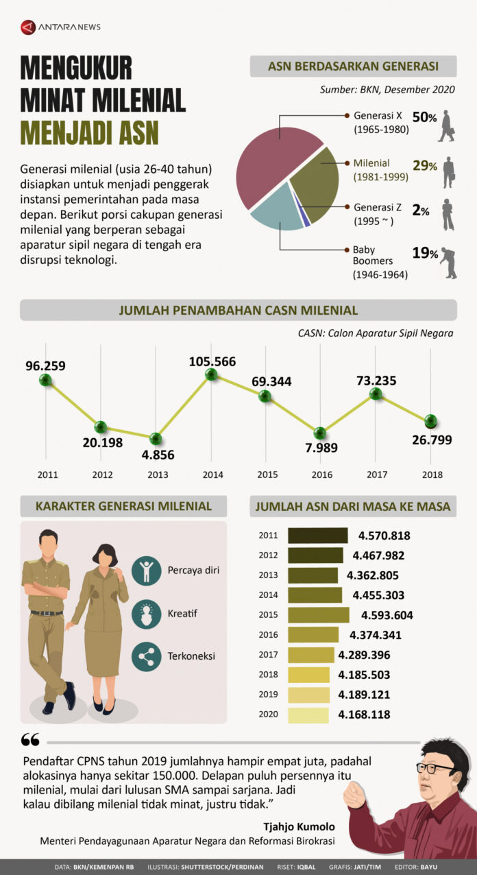 JIC, JAKARTA — Generasi milenial (usia 26-40 tahun) disiapkan untuk menjadi penggerak instansi pemerintahan pada masa depan. Berikut porsi cakupan generasi milenial yang berperan sebagai aparatur sipil negara (ASN) di tengah era disrupsi teknologi.