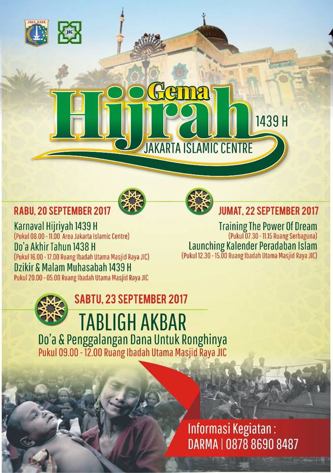 Untuk informasi kegiatan lebih lanjut dapat menghubungi Darma (0878 8690 8487). Marilah bersama kita sukseskan Gema Hijrah di Jakarta Islamic Centre dengan mengajak keluarga, sanak saudara, sahabat dan rekan kerja untuk bersama muhasabah menyambut pergantian tahun 1439 Hijriyah. (ZS)