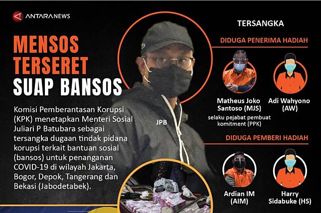 JIC, JAKARTA– Komisi Pemberantasan Korupsi (KPK) menetapkan Menteri Sosial Juliari P Batubara sebagai tersangka dugaan tindak pidana korupsi terkait bantuan sosial (bansos) untuk penanganan COVID-19 di wilayah Jakarta, Bogor, Depok, Tangerang dan Bekasi (Jabodetabek).