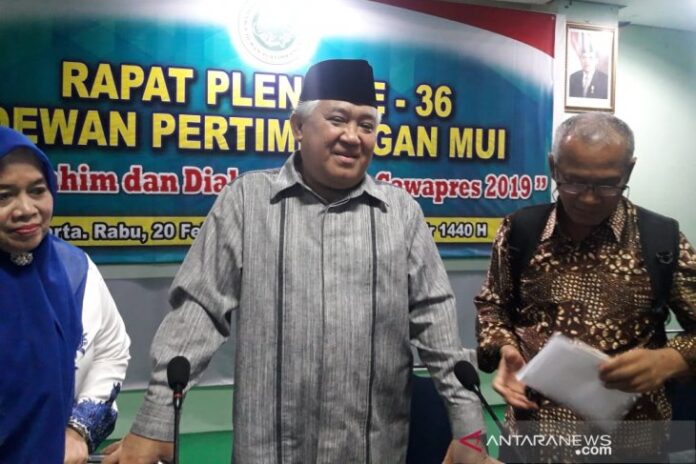 Ketua Dewan Pertimbangan Majelis Ulama Indonesia (Wantim MUI) Din Syamsuddin (tengah) di acara Rapat Pleno Dewan Pertimbangan MUI ke 36 bertajuk Silaturahim dan Dialog Capres-Cawapres 2019, di Kantor MUI, Jakarta, Rabu (20/2/2019). (ANTARA News/ Anita Permata Dewi)