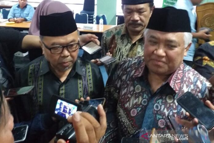 Wakil Ketua Dewan Pertimbangan Majelis Ulama Indonesia Didin Hafidhuddin (kiri) bersama Din Syamsuddin di Gedung MUI, Jakarta, Rabu (27/3/2019). (ANTARA/ Anom Prihantoro)