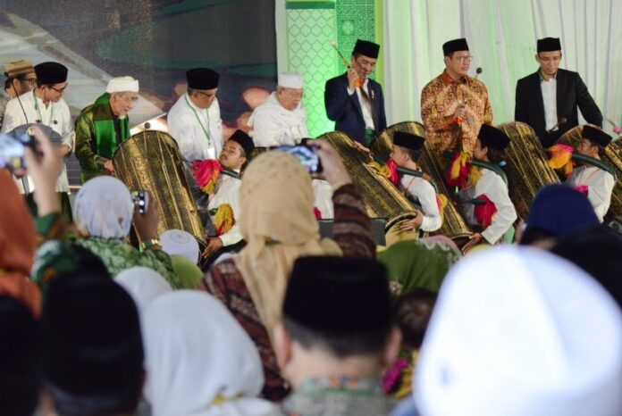 Presiden Joko Widodo (ketiga kanan) bersama Gubernur NTB TGB Zainul Majdi (kanan), Menteri Agama Lukman Hakim Saifuddin (kedua kanan), Ketua PBNU KH Said Agil Siroj (ketiga kiri) dan Ketua MUI KH Ma’ruf Amin (tengah) memukul Gendang Beleq secara bersama-sama saat membuka Munas Alim Ulama dan Konbes Nahdlatul Ulama di Islamic Center NTB di Mataram, Kamis (23/11).