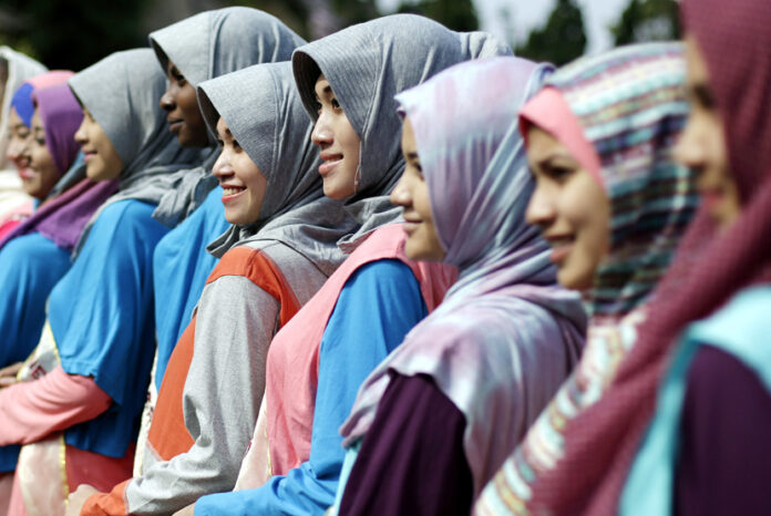 epa03864567 Participants of the World Muslimah 2013 beauty pageant pose for photographs during a training session in Subang, West Java, Indonesia, 12 September 2013. The grand finale of the World Muslimah Beauty 2013 will be held in Jakarta on 18 September. Twenty finalists will compete for the crown. EPA/MAST IRHAM