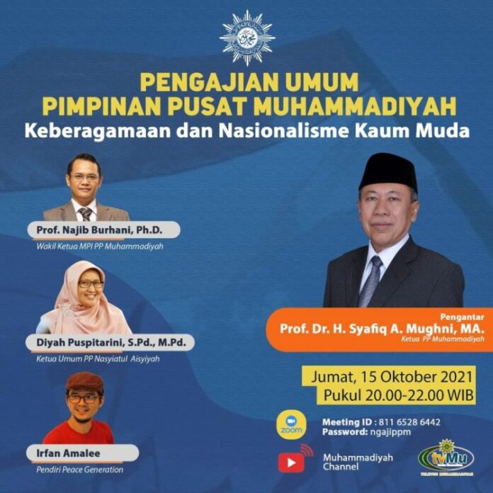 JAKARTA, JIC – Pimpinan Pusat Muhammadiyah mengadakan Pengajian Umum dengan mengangkat tema “Keberagaman dan Nasionalisme Kaum Muda” pada hari Jum’at (15/10). Acara tersebut menghadirkan Prof. Dr. H. Syafiq A. Mughni, MA. Selaku Ketua PP Muhammadiyah dan Prof. Najib Burhani, Ph.D. selaku Wakil Ketua PP Muhammadiyah, Diyah Puspitarini, S.Pd., M.Pd. selaku Ketua Umum PP Nasyiatul Aisyiyah.