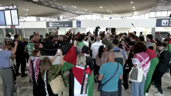 Mengenakan keffiyeh Palestina dan kaos bertuliskan pesan-pesan dukungan Palestina, para pendukung memadati bandara untuk menunjukkan solidaritas mereka.