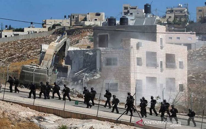 Pasukan Israel berpatroli di dekat alat berat yang menghancurkan sebuah bangunan milik warga Palestina di desa Sur Baher di sisi Yerusalem Timur dan Tepi Barat yang berada di antara Yerusalem Timur dan Tepi Barat, Palestina, Senin (22/7/2019) waktu setempat. Militer Israel sering mengubah jalan dan lahan yang disitanya di wilayah pendudukan Palestina dengan dalih untuk digunakan buat tujuan militer dan pemukim Yahudi. ANTARA/REUTERS/Mussa Qawasma/aa