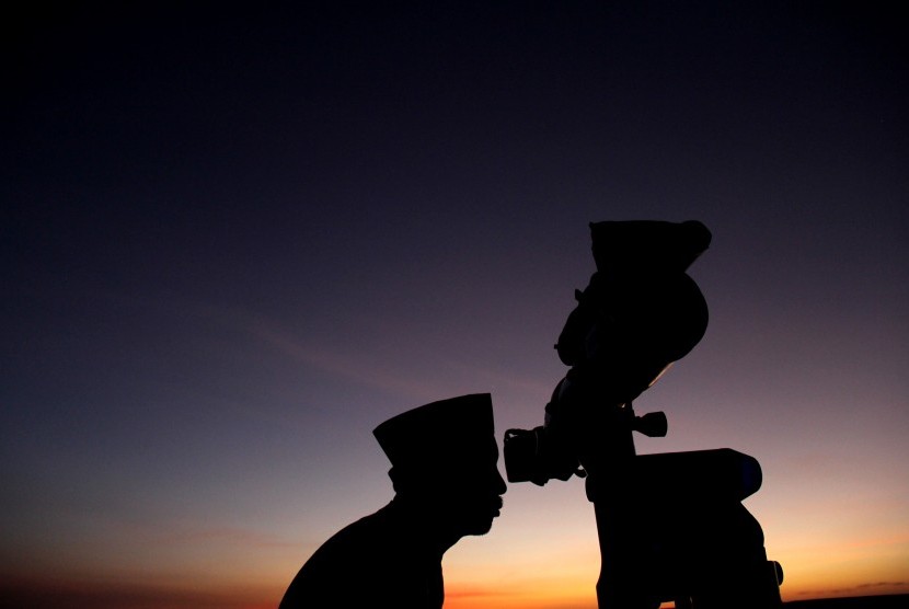 Petugas Kantor Wilayah Kementerian Agama Sulawesi Selatan melakukan pemantauan hilal (bulan) menggunakan teropong untuk menentukan hari Idul Adha 1437 Hijriyah di Makassar, Sulawesi Selatan, Kamis (1/9).  Foto: Antara/Abriawan Abhe