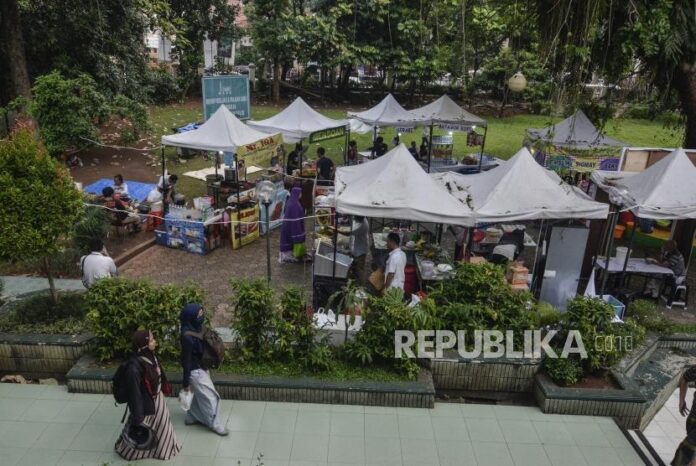 Bazar Ramadhan di Masjid Sunda Kelapa. Pengunjung melintas di dekat stand bazar Ramadhan di Masjid Sunda Kelapa, Jakarta Pusat, Senin (20/5).   Foto: Fakhri Hermansyah