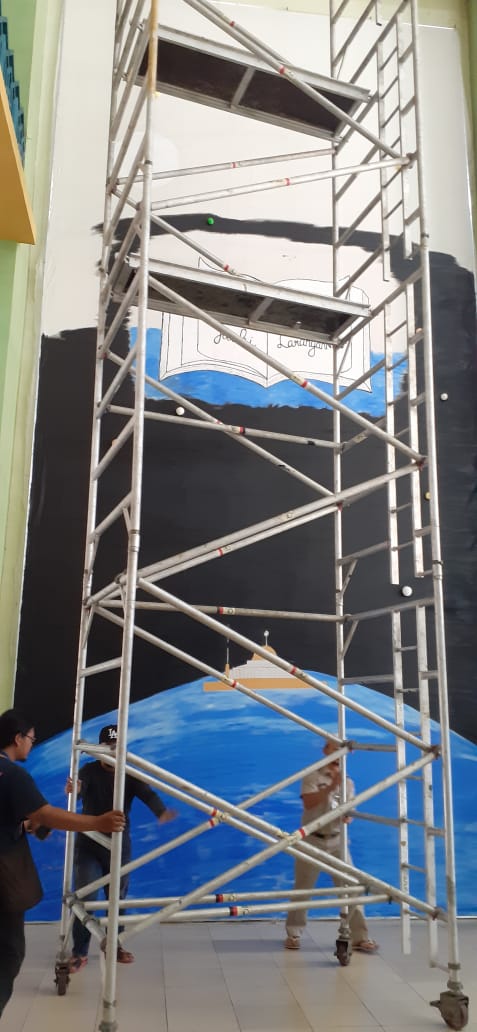 JIC – Paolo (54 th) seorang seniman sedang melukis dengan ukuran jumbo di lobi Masjid Raya Jakarta Islamic Centre, kata Ahmad Juhandi Kepala Sekretriat Jakarta Islamic Centre (7/5/19).